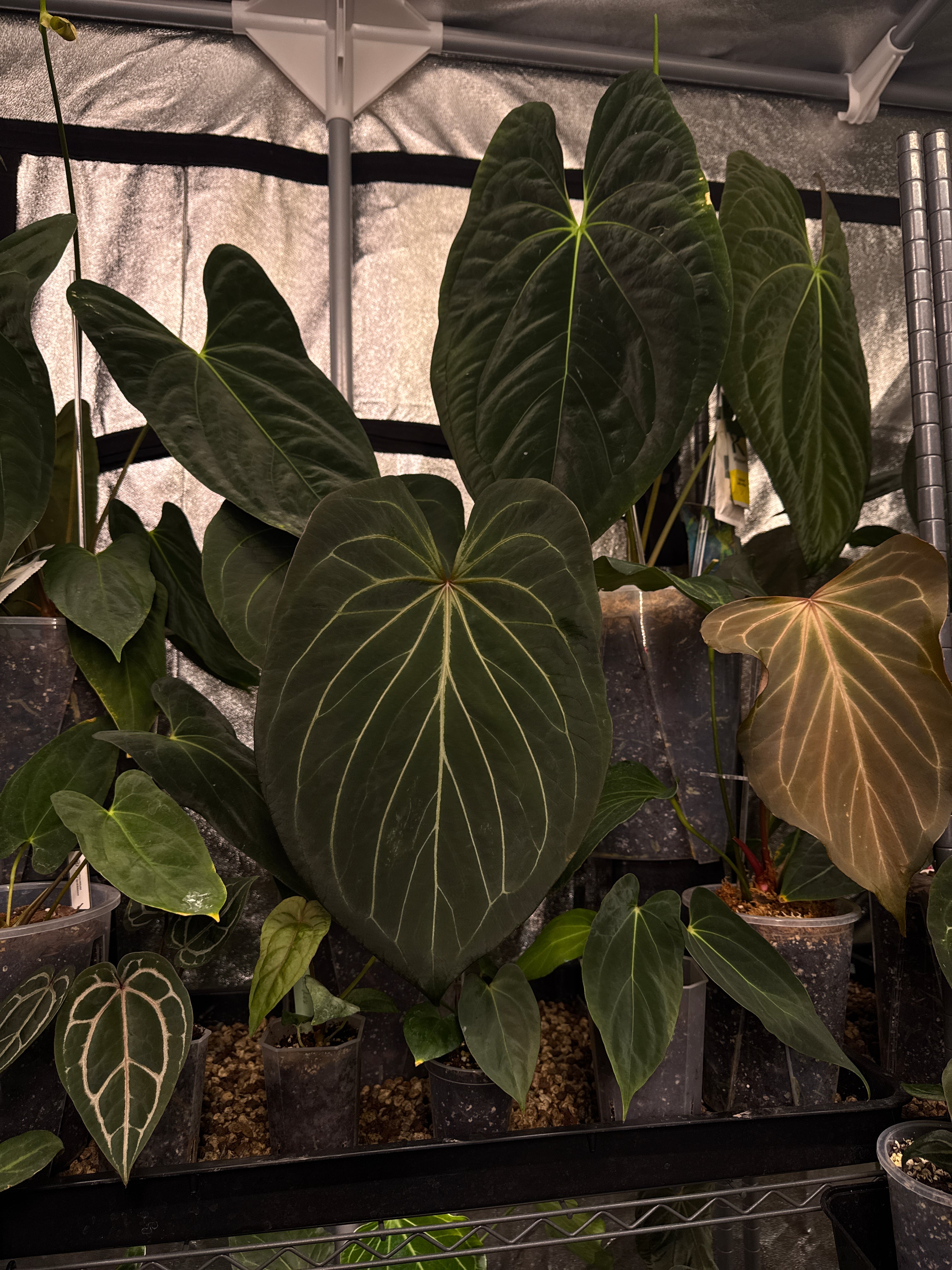 For measuring the light strength, I use a PPFD light meter that measures the number of PAR photons reaching the (plant) surface. PPFD measures the density of light that plants use for photosynthesis. Similar to how we express brightness in lux, PPFD is quantified in micromoles per second per square meter (µmol/s/m²). Measure the strength of the light at a distance of the plant that is the closest to the light). In general, the ideal light level for (foliage) Anthurium is between 20-100 umol/m2/s.