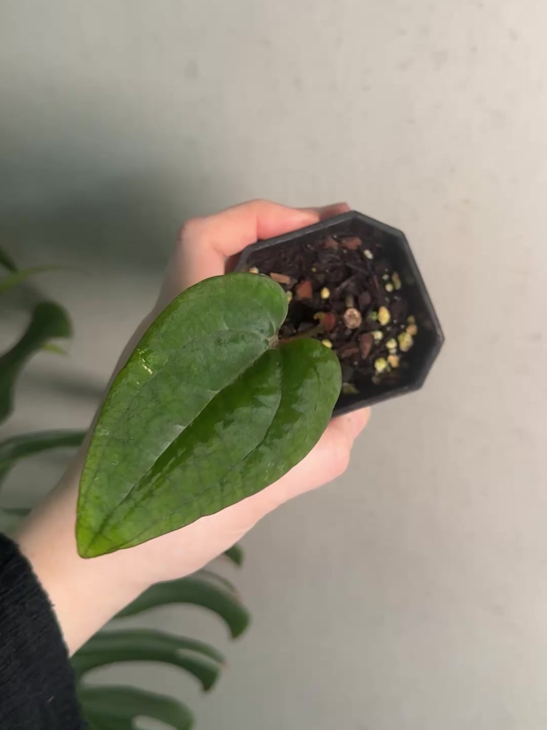 Offered is a top and mid-cutting of Anthurium Ace of Spades Dark Form F1 (SKG lineage).
