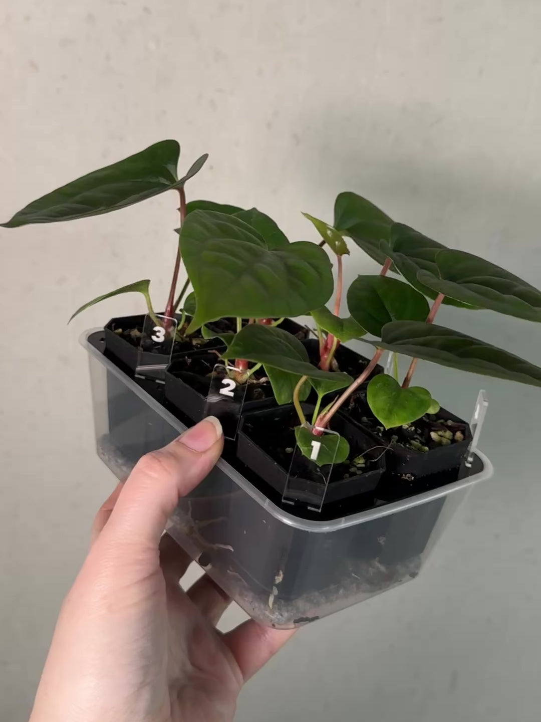 Offered are seedlings of a cross between Anthurium (Dark Phoenix x Goliath) and (sp. Napo x Luxurians), both shown in the last 3 photos.